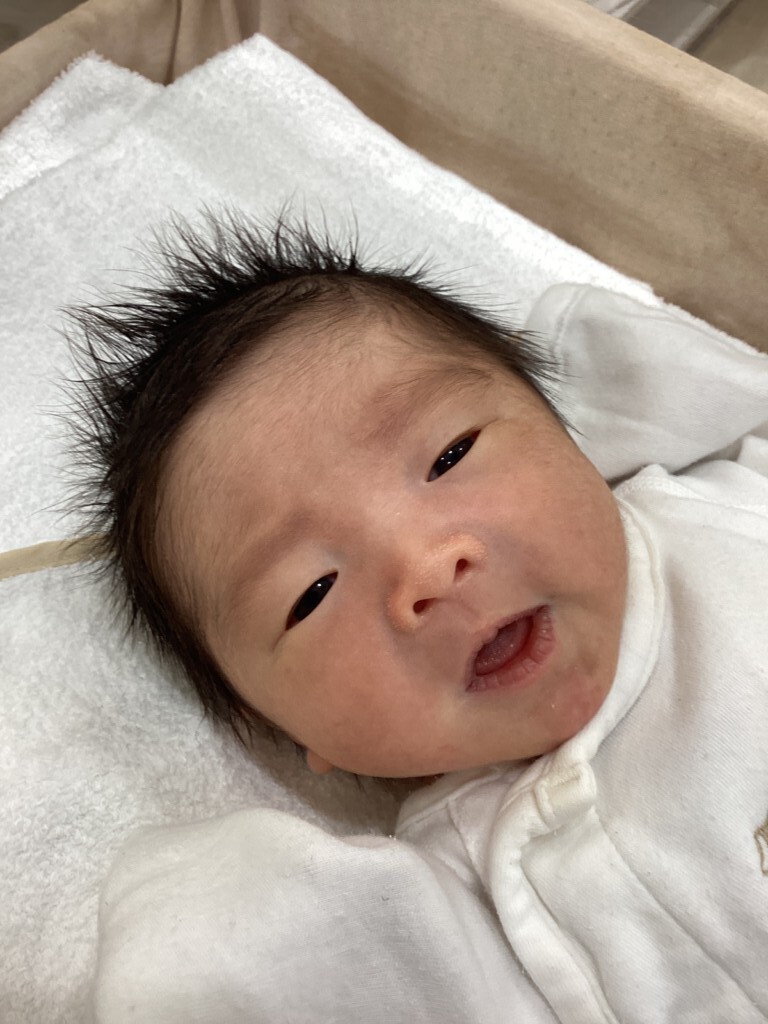 予定より早く産まれてきてくれましたね。パパとママに早く会いたかったんですね。とっても上手な呼吸法と息みでしたよ。今年は賑やかな年越しになりますね。ご出産おめでとうございます。