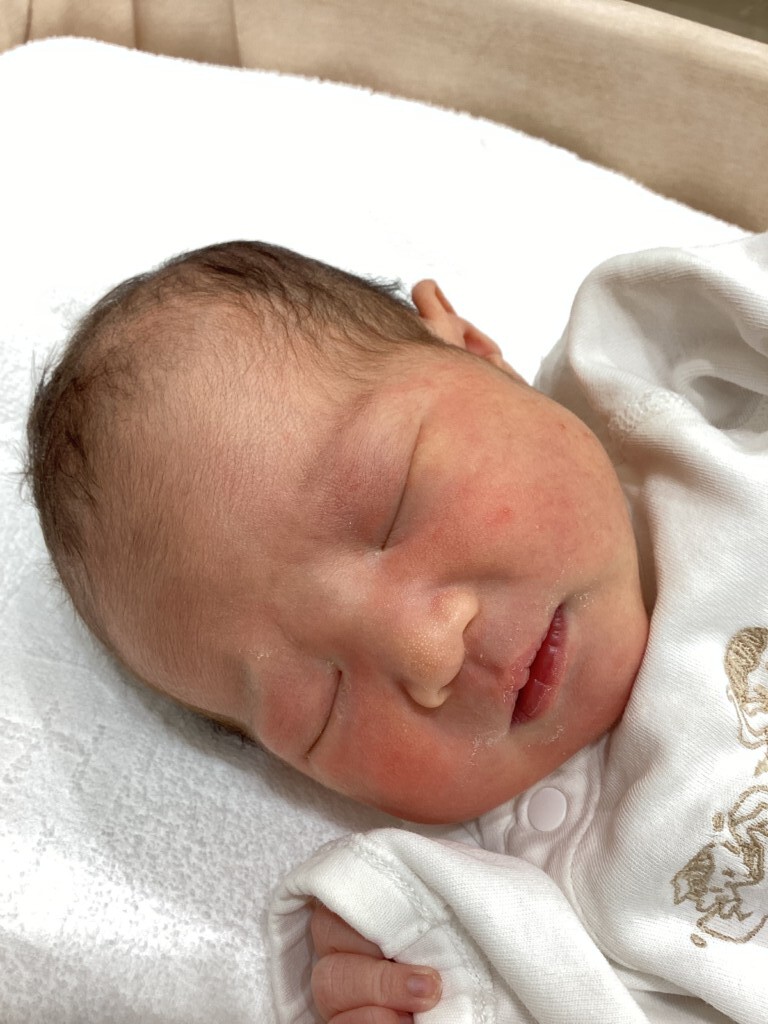 分娩台に乗ってからの努責が大変でした。パパの力も借りて、とっても上手に頑張って下さいました。お目目くりくりのとっても可愛い子ですね。3人での新生活楽しんで下さい。ご出産おめでとうございます。